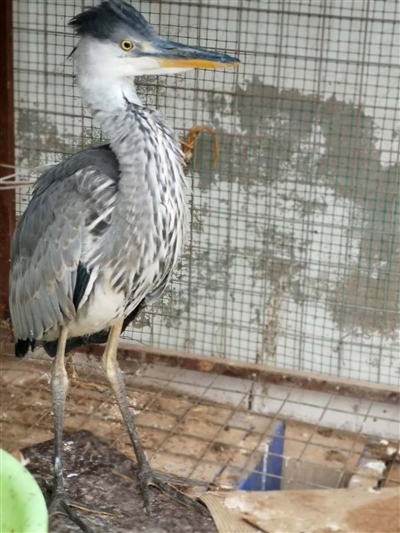 經(jīng)有經(jīng)驗(yàn)的民警辨認(rèn),這是一只蒼鷺幼鳥。這只鳥身高約70公分,長長的尖嘴,身著灰色體羽,頭戴深灰色羽冠,兩條大長腿格外顯眼,白色的前頸縱向排列著黑灰色條紋。民警聯(lián)系獸醫(yī)為其做了體檢,經(jīng)檢查,這只鳥并無傷病,可能是由于剛出窩飛行能力不強(qiáng)、捕食能力不足,造成體力虛弱。民警買來小魚,只見這只鳥狼吞虎咽享用起來,不久便精神十足,開始啄民警。看到它體力開始恢復(fù),民警懸著的心也就放下了。民警計(jì)劃選擇合適時(shí)間和地方將其放飛。
