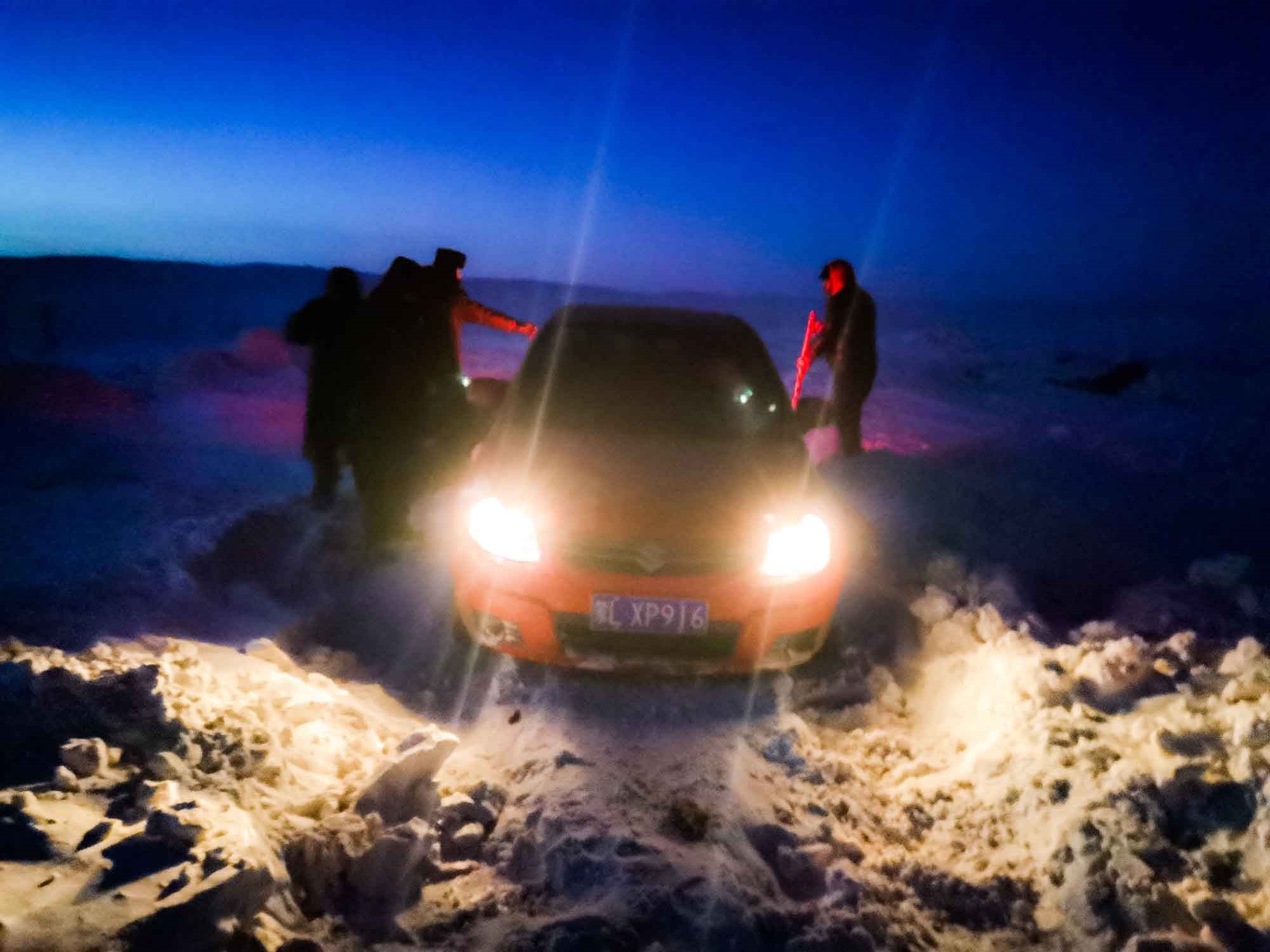 1月17日17時,那木吉拉與弟弟一同駕車返回百靈廟鎮(zhèn),在途經(jīng)一處被風(fēng)谷地時,由于晚上視線較差,且此處坡度較大,不慎陷入雪中無法動彈,只得撥通電話請求派出所救助。草原上沒有遮蔽物,常常到了下午就刮起大風(fēng),吹得積雪覆蓋在土地上分不清地勢高低,民警們按著平日下鄉(xiāng)走訪的經(jīng)驗(yàn)摸索前進(jìn),經(jīng)過近一小時才到達(dá)現(xiàn)場,了解情況后,民警們將準(zhǔn)備好的熱水和棉大衣遞給牧民便展開了救援工作。在零下35度的冬夜里,民警們用鐵鍬和雙手經(jīng)過近兩個小時的奮戰(zhàn)終于將40厘米厚的積雪清理干凈,并將被困車輛通過前拉后推的方式移至平坦區(qū)域。