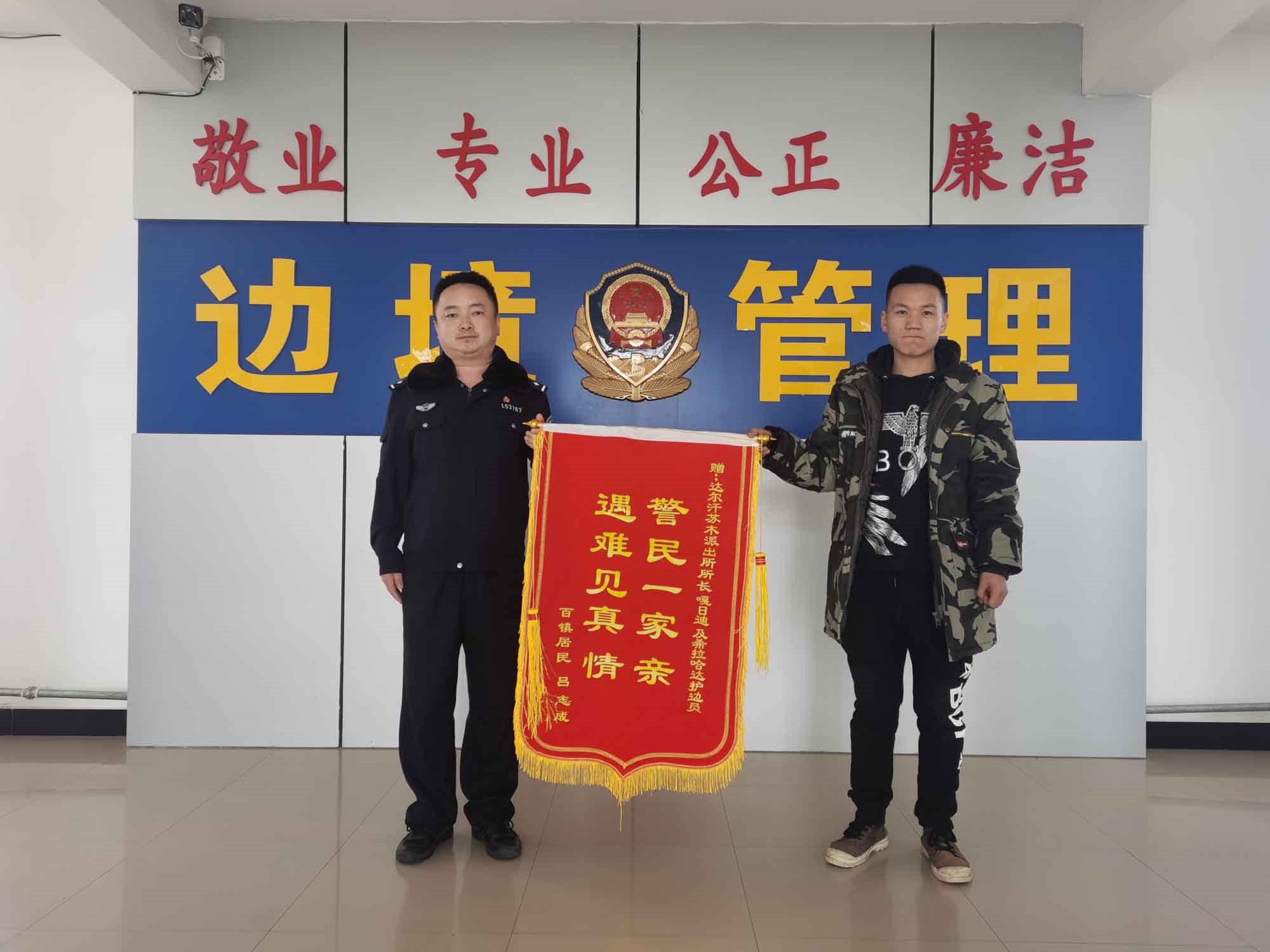 “民警同志太感謝你們了,有你們在我們就感覺安心多了?!?月19日早晨,內(nèi)蒙古包頭市達(dá)茂旗達(dá)爾罕蘇木牧民那木吉拉“嘎吱嘎吱”的踩著潔白的積雪走進(jìn)包頭邊境管理支隊(duì)達(dá)爾罕邊境派出所,一邊說著一邊拿出印有“警民一家親,遇難見真情”的錦旗遞給民警。