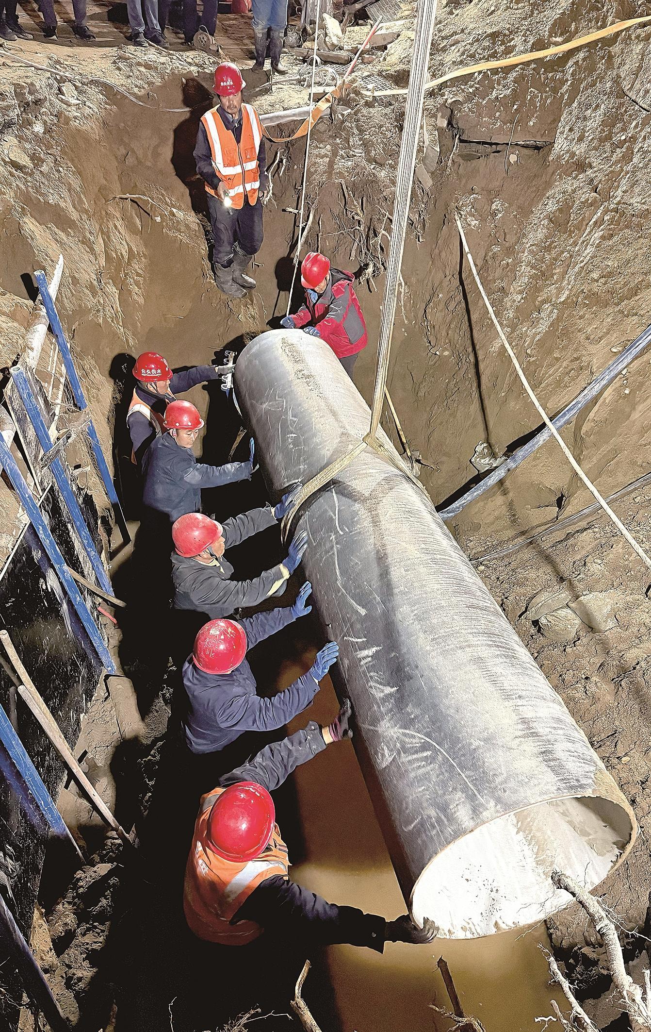 夜色漸深,氣溫持續(xù)下降,搶修現(xiàn)場卻燈火通明、熱火朝天。挖掘、排水、清理、焊接……每一個(gè)環(huán)節(jié)都爭分奪秒,井然有序。黨員干部沖鋒在前,帶頭跳入泥水中作業(yè);其他維修人員輪番上陣,困了就在工程車?yán)锊[一會(huì)兒,餓了就蹲在路邊匆匆扒幾口盒飯。頂風(fēng)冒雨的兩個(gè)日夜,他們心中只有一個(gè)信念:早一分鐘修復(fù),市民就早一分鐘恢復(fù)正常用水,城市秩序就早一分鐘恢復(fù)。