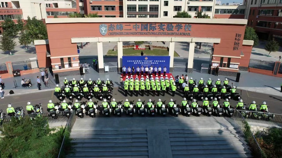 北疆新聞呼和浩特9約3日電(記者 楊凈毓)8月30日,赤峰市公安局交管支隊(duì)在赤峰二中國(guó)際實(shí)驗(yàn)學(xué)校門前,舉行全市公安交管部門“護(hù)校安園”專項(xiàng)行動(dòng)啟動(dòng)暨護(hù)學(xué)崗警用摩托車配發(fā)儀式。