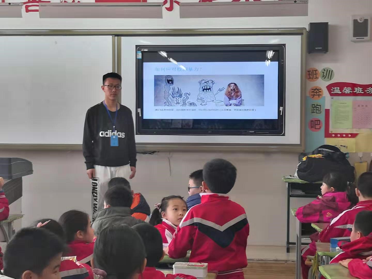 只見一個(gè)長(zhǎng)相魁梧的“歹徒”不僅擋住同學(xué)們回家的路,還口出狂言。而路過(guò)的幾名同學(xué)正不知所措。原來(lái)這是由北垣小學(xué)的師生們正在進(jìn)行校園暴力演習(xí),且當(dāng)天還邀請(qǐng)了52位律師走進(jìn)校園,為同學(xué)們上了一堂生動(dòng)的法律常識(shí)課。