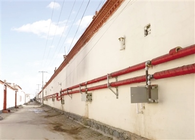 在臺(tái)閣牧鎮(zhèn)沙家營村,記者看到供熱管網(wǎng)改造施工時(shí)開挖的街巷已完成路面硬化;換熱站內(nèi)運(yùn)轉(zhuǎn)的機(jī)器隆隆作響,輸送熱源的管道摸起來十分燙手;在成排的居民房屋后墻整齊地安裝了包裹保溫材料的供熱管道和計(jì)量表箱,暖氣經(jīng)由這些管道輸送到各家各戶。