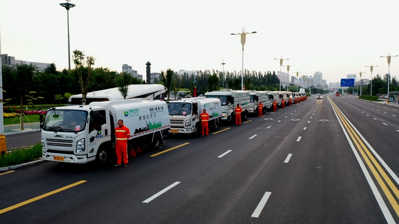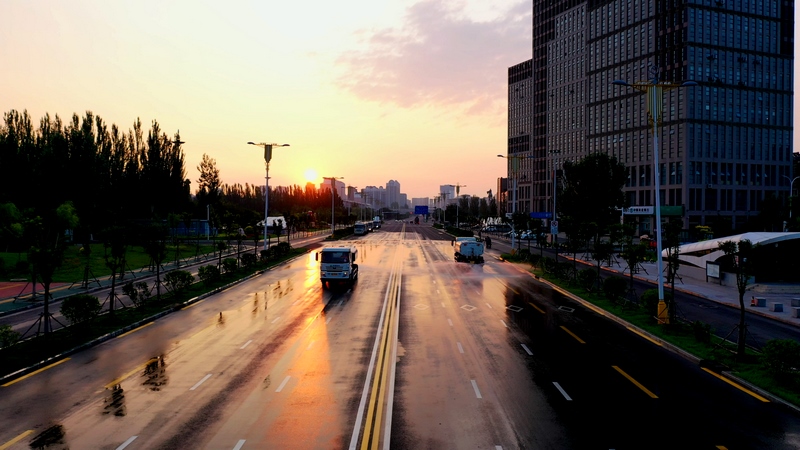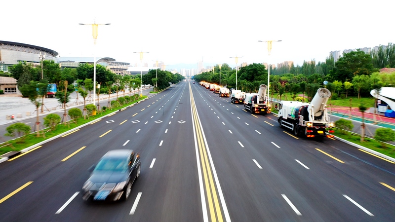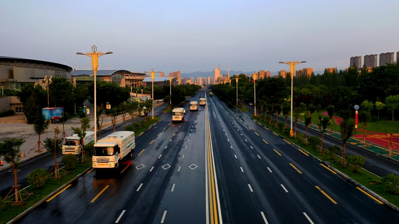 當(dāng)東方微微發(fā)白,高壓沖洗車強力開路,將道路上的廢棄物、積灰沖到道路兩側(cè)。