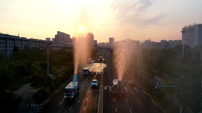 凌晨6點,晨曦初露,朝霞輕染,被稱作“高霧炮”的多功能抑塵車和高壓水車開始霸氣地聯(lián)合作業(yè),一道道水霧騰空而起或四散鋪開,清潔降塵,提高空氣濕度。