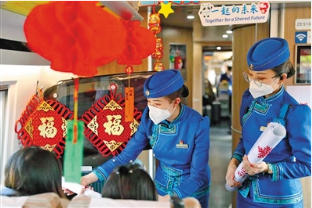 2022年2月15日,在包頭開往北京北的G2494次復興號列車上,高鐵乘務員與旅客們一起度過溫暖又美好的旅程。