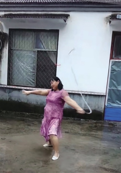 “清水河”大媽與抖音的相遇是在3年前。當(dāng)時,遭遇了親人離世的她悲傷難抑,為了讓她分散注意力,她的女兒幫她下載了抖音。此后,大媽時常刷刷抖音,也慢慢從中悟出了一個道理,就是生活中不如意十之八九,人要好好活著,要快樂地活著。很快,大媽就從悲傷中走了出來,也學(xué)著在抖音上拍攝自己的日常。雖然起初視頻點(diǎn)贊量不多,但能記錄下生活的點(diǎn)滴足以讓她格外開心。一直到了去年9月份,大媽無意之中發(fā)布了一條雨中甩鞭子的視頻。視頻中,大媽身著一襲紅裙,有節(jié)奏地甩起了十幾斤重的鐵制麒麟鞭。“啪嗒、啪嗒、啪嗒……”聲聲響亮、威風(fēng)凜凜。就是這條視頻讓她一夜爆紅。此后短短幾天,這條視頻的點(diǎn)贊量就突破了200萬,一時間,抖音上還掀起了一陣和大媽合拍的熱潮。
