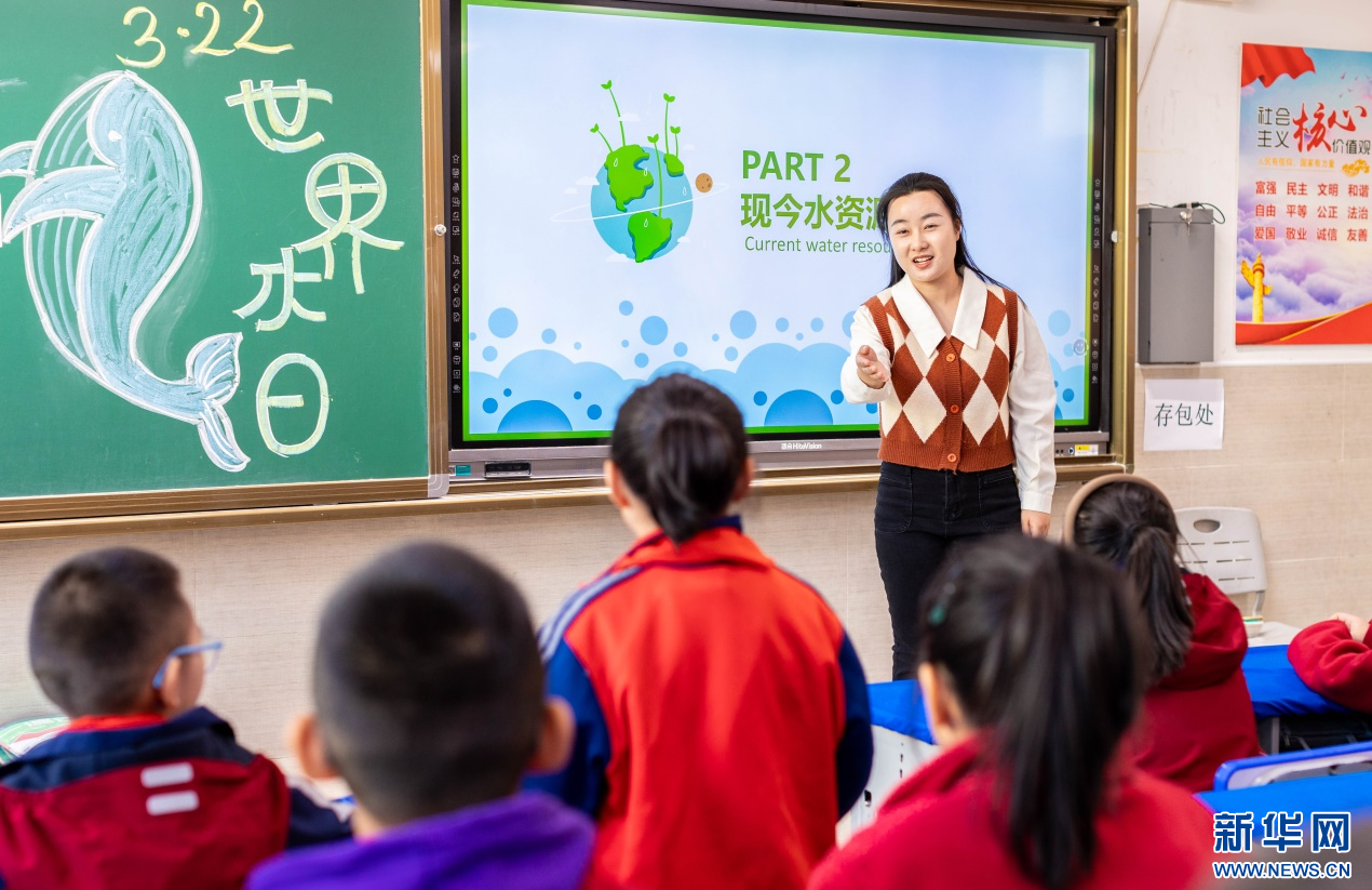 ??3月20日,呼和浩特市玉泉區(qū)石東路小學(xué)老師向?qū)W生們講解“保障我國(guó)水安全”等知識(shí)。新華網(wǎng)發(fā)(丁根厚 攝)