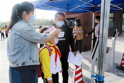 “等了這么久,終于可以和同學(xué)們說(shuō)句:早上好?!?月2日,早上7點(diǎn)剛過(guò),通遼新城第一中學(xué)小學(xué)部二年一班的班主任崔老師早早的在校門(mén)口,迎接班里的小朋友們。記者在校門(mén)口看到,此時(shí),小學(xué)部二、三年級(jí)的小朋友已經(jīng)陸續(xù)入校了,顯然,“萌娃”們已經(jīng)被校門(mén)口的層層關(guān)卡震撼到了,幸好,在眾多老師的幫助和指引下順利進(jìn)入了校門(mén)。進(jìn)入了校門(mén)后,還有一道重要關(guān)卡,測(cè)量體溫,習(xí)慣了伸出手臂來(lái)測(cè)量體溫的“萌娃”們,對(duì)著紅外線測(cè)溫儀卻不知所措了,有的對(duì)著測(cè)溫儀伸出了手臂、有的對(duì)著測(cè)溫儀行禮,著實(shí)“萌”翻了現(xiàn)場(chǎng)所有人?!按蘩蠋煟覀兌枷肽懔??!币?jiàn)到幾位小朋友要湊到跟前兒,崔老師立刻提醒同學(xué)們:我也很想念你們,但是我們要保持“一米”的距離,快去教室吧!小朋友們被“殘忍”拒絕,很是失落。