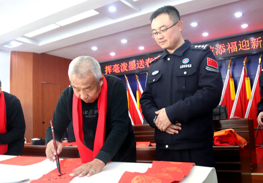 活動現(xiàn)場氣氛熱烈,書法家們鋪展紅紙、揮毫潑墨,將自己的書法造詣轉(zhuǎn)化為民警們喜聞樂見的傳統(tǒng)藝術(shù)形式,一幅幅吉祥如意的春聯(lián),一張張紅紅火火的“?!弊郑谡故緜鹘y(tǒng)文化之美的同時,傳遞著冬日溫暖,營造出文明祥和、時尚雅致的節(jié)日氛圍,讓在場人員感到了濃濃的年味。