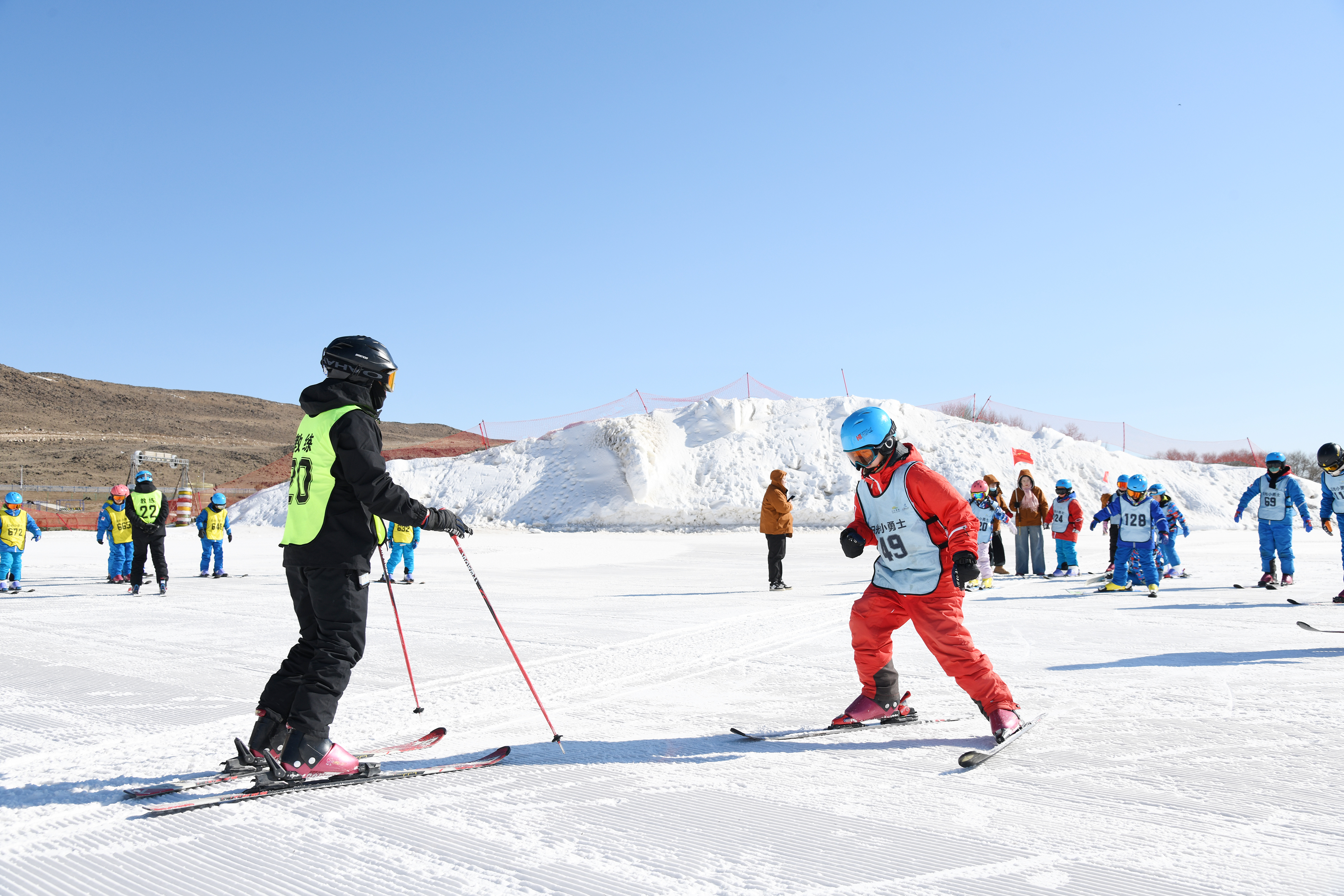 “把腳尖對準(zhǔn)雪板凹槽,腳后跟用力下踩?!薄半p腿呈‘V’字形,與肩同寬,掌握好平衡?!倍顮I學(xué)員在烏蘭察布日光火山大河灣滑雪度假區(qū)專業(yè)教練的悉心指導(dǎo)下,從最基礎(chǔ)的穿戴裝備學(xué)起,逐漸掌握了犁式轉(zhuǎn)彎、半犁式轉(zhuǎn)彎等技巧。經(jīng)過一個多小時的學(xué)習(xí)和鍛煉,有一定基礎(chǔ)的學(xué)員已經(jīng)可以在雪道上腳踏雪板飛馳而下,并流暢地完成大回轉(zhuǎn)等動作;有的學(xué)員偶爾摔倒,也會迅速起身繼續(xù)訓(xùn)練。