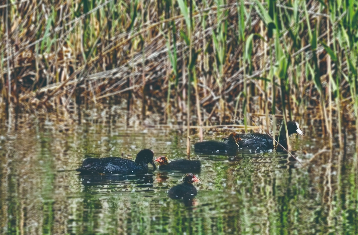 在不遠(yuǎn)處的水域,白骨頂雞一家成為眾人關(guān)注的焦點(diǎn)。幾只剛剛出窩的幼鳥,圓滾滾、毛茸茸的,正好奇地在水中游動,動作略顯笨拙,還不時(shí)發(fā)出稚嫩的叫聲。成年白骨頂雞則忙著覓食,它們一頭扎進(jìn)水里,再浮出水面時(shí),嘴里已叼著小魚小蝦,隨后快速游向幼鳥喂食。幼鳥們爭搶食物的場景,充滿了趣味。