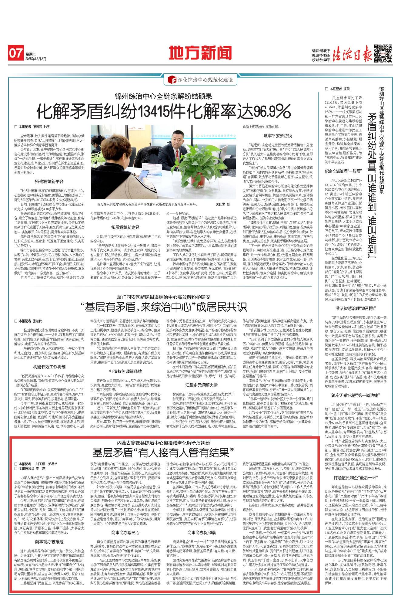 2025年12月2日,《法治日報(bào)》第7版刊發(fā)題為《內(nèi)蒙古商都縣綜治中心攥指成拳化解矛盾糾紛 基層矛盾“有人接有人管有結(jié)果”》的文章,報(bào)道了內(nèi)蒙古商都縣以“商都的事情在商都辦、商都的事情商量著辦”為核心,聯(lián)動(dòng)公安局、檢察院、法院、司法局、工信局等多部門攥指成拳,構(gòu)建“只進(jìn)一扇門、訴求有人辦、事事依法解”的“一站式”化解體系,用實(shí)際行動(dòng)筑牢轄區(qū)和諧穩(wěn)定防線。