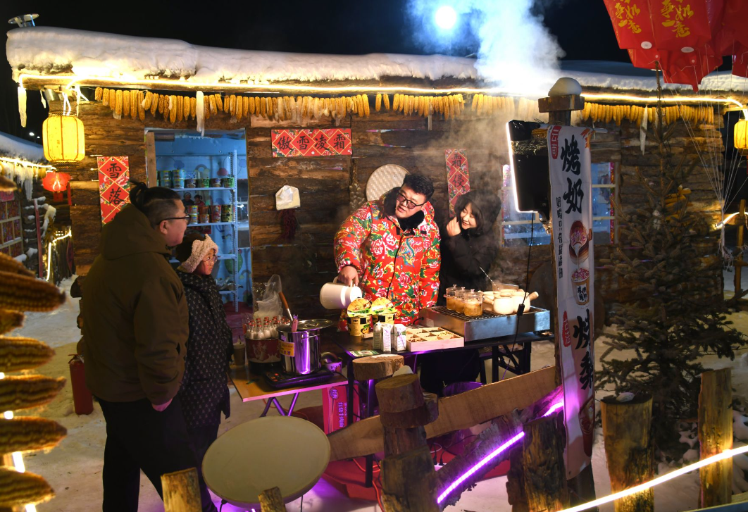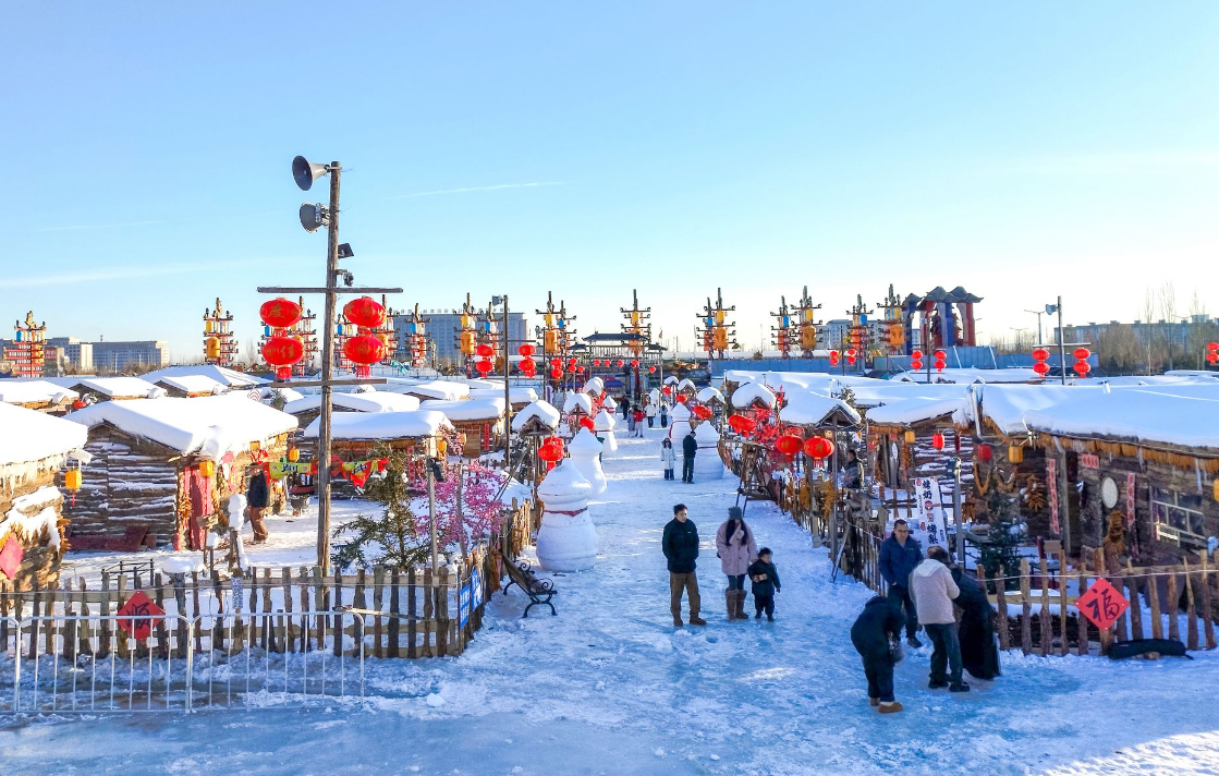 踏入雪鄉(xiāng)板塊,50個(gè)復(fù)刻北方傳統(tǒng)風(fēng)貌的院落集群映入眼簾,木柵欄上垂掛的紅燈籠與蓬松雪層相映成趣,屋檐下懸垂的雪舌、雪簾勾勒出童話般的輪廓。每個(gè)院落都藏著專屬打卡場景,推門而入可見家庭場景,窗外是皚皚白雪,屋內(nèi)飄著燒烤、火鍋和奶茶的醇厚香氣,瞬間驅(qū)散冬日寒意。游客穿梭其間,鈴鐺輕響,為這份雪鄉(xiāng)煙火氣增添了濃郁的民族風(fēng)情。