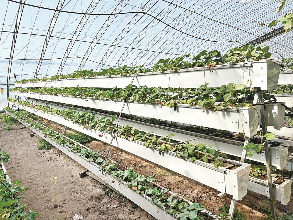 草莓在種植架上長(zhǎng)勢(shì)良好。