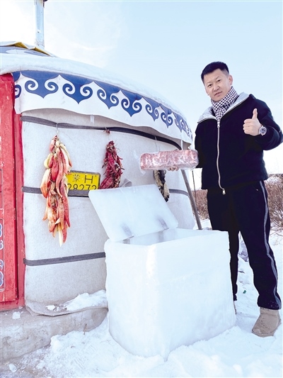12月8日,記者幾經(jīng)周折與視頻中的小伙張智磊取得了聯(lián)系。張智磊今年36歲,從小在錫林郭勒大草原長大,在當(dāng)?shù)刂饕雠Q蛉馍?。對于意外走紅,張智磊直言自己也沒有想到?!耙曨l是在錫林浩特市南郊向陽村叔叔家院子里的蒙古包拍攝的。記得小時候,每到冬天,周邊牧民都是把食物埋在雪地里儲存。我前幾天也拍了一個從雪地里找羊腿的視頻,有粉絲留言‘放在雪地里會不會忘記位置容易丟了’,然后我就突發(fā)奇想,干脆做個‘冰箱’把年貨放進(jìn)去?!睆堉抢诟嬖V記者,他從12月3日開始凍冰塊,12月4日把凍結(jié)實(shí)的冰塊拿出來用冷水黏合,因?yàn)楸鶋K低于0攝氏度,遇水就會瞬間黏在一起,然后開始著手打磨,棱棱角角都用電熨斗熨平整,再加上蓋,一個“冰箱”就完成了。