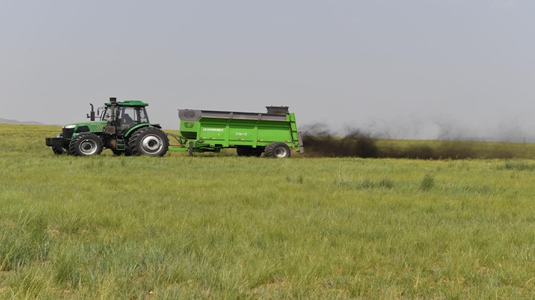 在退化放牧場治理區(qū),施工人員用推土機推平坑洼不平的風(fēng)蝕坑、整理棄土堆;按照噴幅寬6~8米的行距,用拋肥機將牛羊固態(tài)糞肥和含有氮、磷、鉀等生物有機液態(tài)肥拋灑在草場上,增加土壤肥力;用切根機將稀疏的羊草切開、促進分蘗繁殖、復(fù)壯,增加種群密度;采用栽設(shè)4×4米網(wǎng)格狀沙幛、覆蓋草簾來降溫保墑抗旱保苗,與此同時與項目區(qū)牧戶簽訂三年的禁牧、生態(tài)補償、管護協(xié)議。