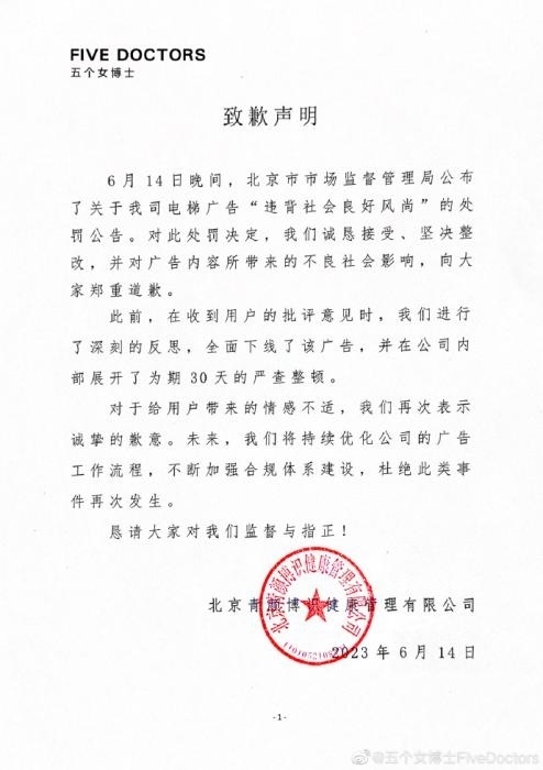 6月14日晚,“五個(gè)女博士”也在其微博發(fā)布致歉聲明稱,對此處罰決定,誠懇接受、堅(jiān)決整改,并對廣告內(nèi)容所帶來的不良社會影響,向大家鄭重道歉。