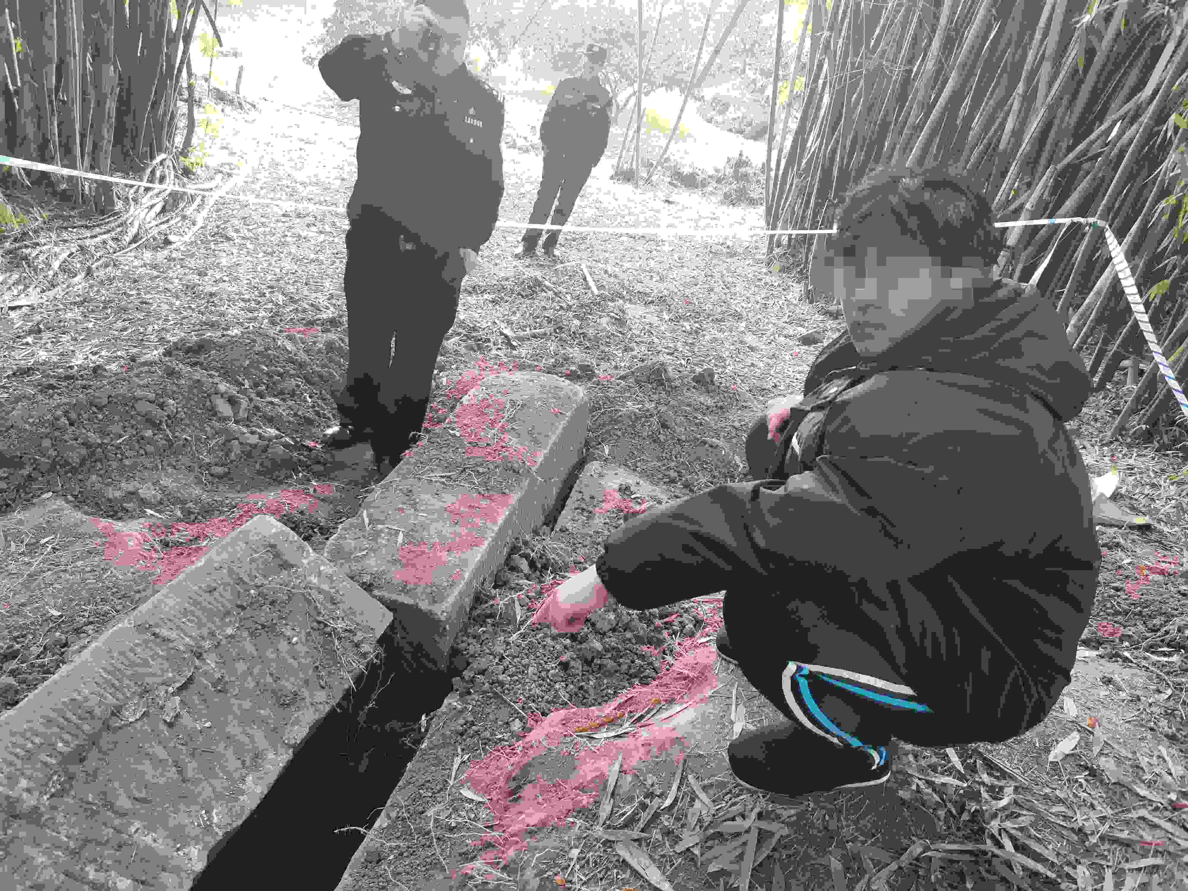 韓某家族的這座祖墳地處一片竹林中,離最近的房屋直線距離不足20米。為此,他趕到現(xiàn)場發(fā)現(xiàn),墓室上的土有多處被挖痕跡,但墓門上的石頭還沒被打開?!斑@個地方是條大路,白天也沒人看到有人來過?!表n某懷疑有人盯上了他家的祖墳,想要盜墓,并判斷那些人還會再來。