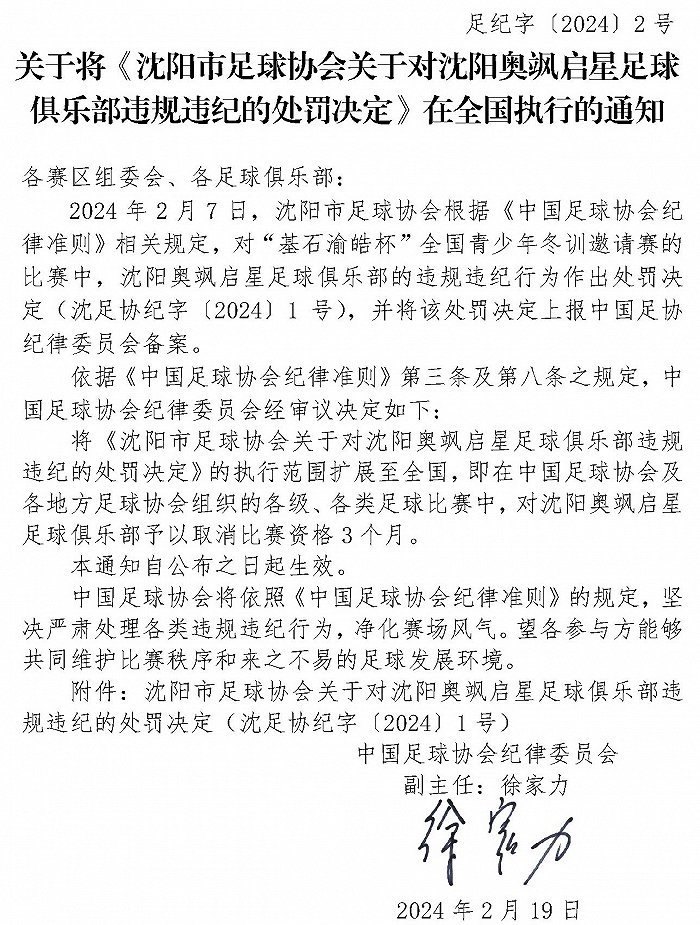 央視網(wǎng)消息:據(jù)中國足球協(xié)會2月21日發(fā)布通知,將《沈陽市足球協(xié)會關(guān)于對沈陽奧颯啟星足球俱樂部違規(guī)違紀(jì)的處罰決定》及《遼寧省足球運(yùn)動協(xié)會關(guān)于對教練員吳高俊違規(guī)違紀(jì)的處罰決定》在全國執(zhí)行,具體內(nèi)容如圖: