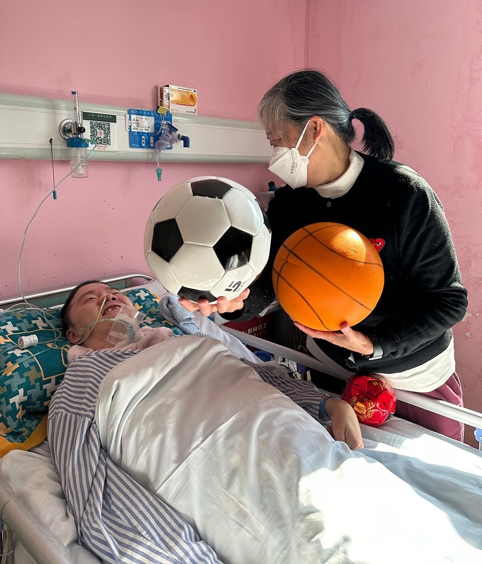 張昌碩恢復微小意識后,鄭建英從家里帶了兩顆昌碩最喜歡的足球到病床前,一大一小。每次,她舉起一顆足球放到他眼前,問他:“哪只是曼聯(lián)的?”昌碩的視線會左右移動,選擇正確的那一顆。