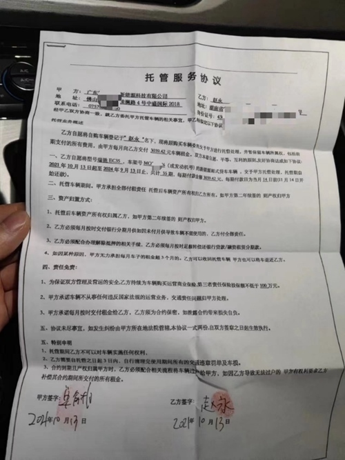 趙永開(kāi)車(chē)來(lái)到位于廣東省佛山市的“車(chē)管部門(mén)”辦理“托管”手續(xù)。托管協(xié)議顯示,車(chē)輛由廣東智富卓越新能源科技有限公司托管處理,公司每月給趙永支付租金3000余元。