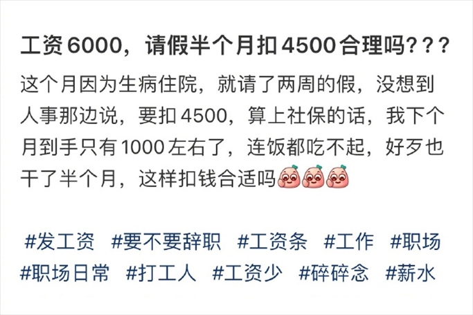 近日,#工資6000請(qǐng)假半個(gè)月被扣4500#的話(huà)題登上熱搜,引發(fā)關(guān)注。