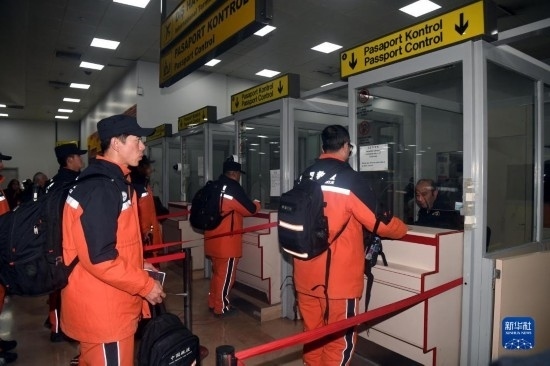 2月16日,中國救援隊隊員在土耳其阿達(dá)納國際機場乘坐國航包機回國。