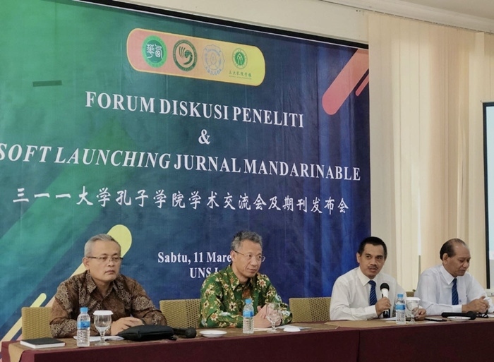 人民網(wǎng)雅加達(dá)3月12日電 (記者張杰)11日下午,三一一大學(xué)孔子學(xué)院學(xué)術(shù)期刊《Mandarianable》發(fā)布會(huì)及四周年生日會(huì)在梭羅隆重舉行。西華大學(xué)校長(zhǎng)劉樹根、三一一大學(xué)學(xué)術(shù)事務(wù)副校長(zhǎng)(尤努斯)Mr.Yunus教授、研究與創(chuàng)新副校長(zhǎng)(坤卓落)Mr.Kuncoro教授、合作與信息副校長(zhǎng)(夏啟丹)Mr. Sajidan教授、成都市政府代表潘文吉、張友東、羅會(huì)成、三一一大學(xué)部分院系代表等嘉賓出席了本次發(fā)布會(huì)。