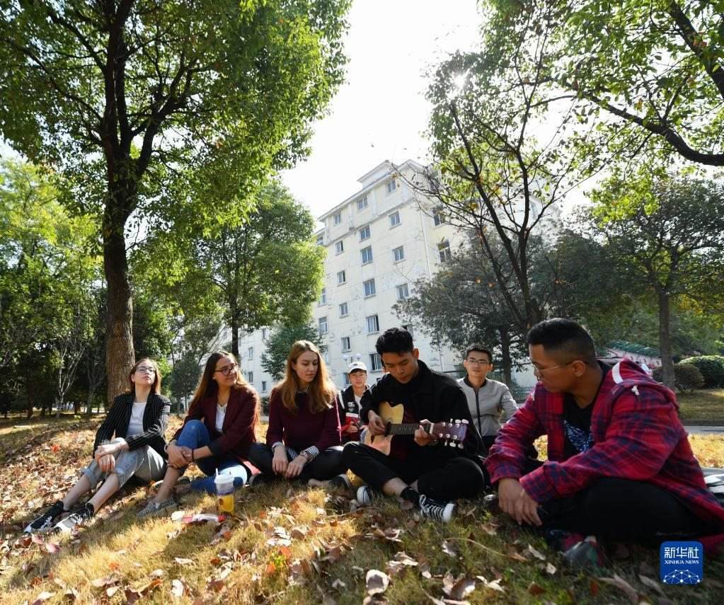 作為中俄交換生在江西省華東交通大學就讀的俄羅斯姑娘米卡科娃·娜塔莉亞(左三)在學校欣賞同學彈奏(2019年10月31日攝)。新華社記者 胡晨歡 攝