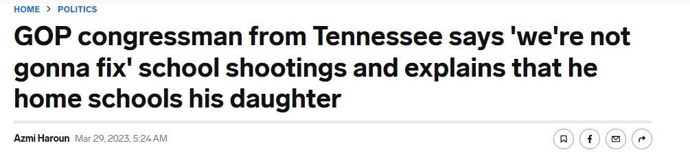據(jù)美國《商業(yè)內(nèi)幕》新聞網(wǎng)站29日報道,田納西州納什維爾市小學發(fā)生槍擊事件后,該州眾議院議員蒂姆·伯切特面對如果出現(xiàn)類似槍擊事件“該如何保護孩子”的質問,直言并未找到解決方法,會讓他的女兒“在家讀書”。