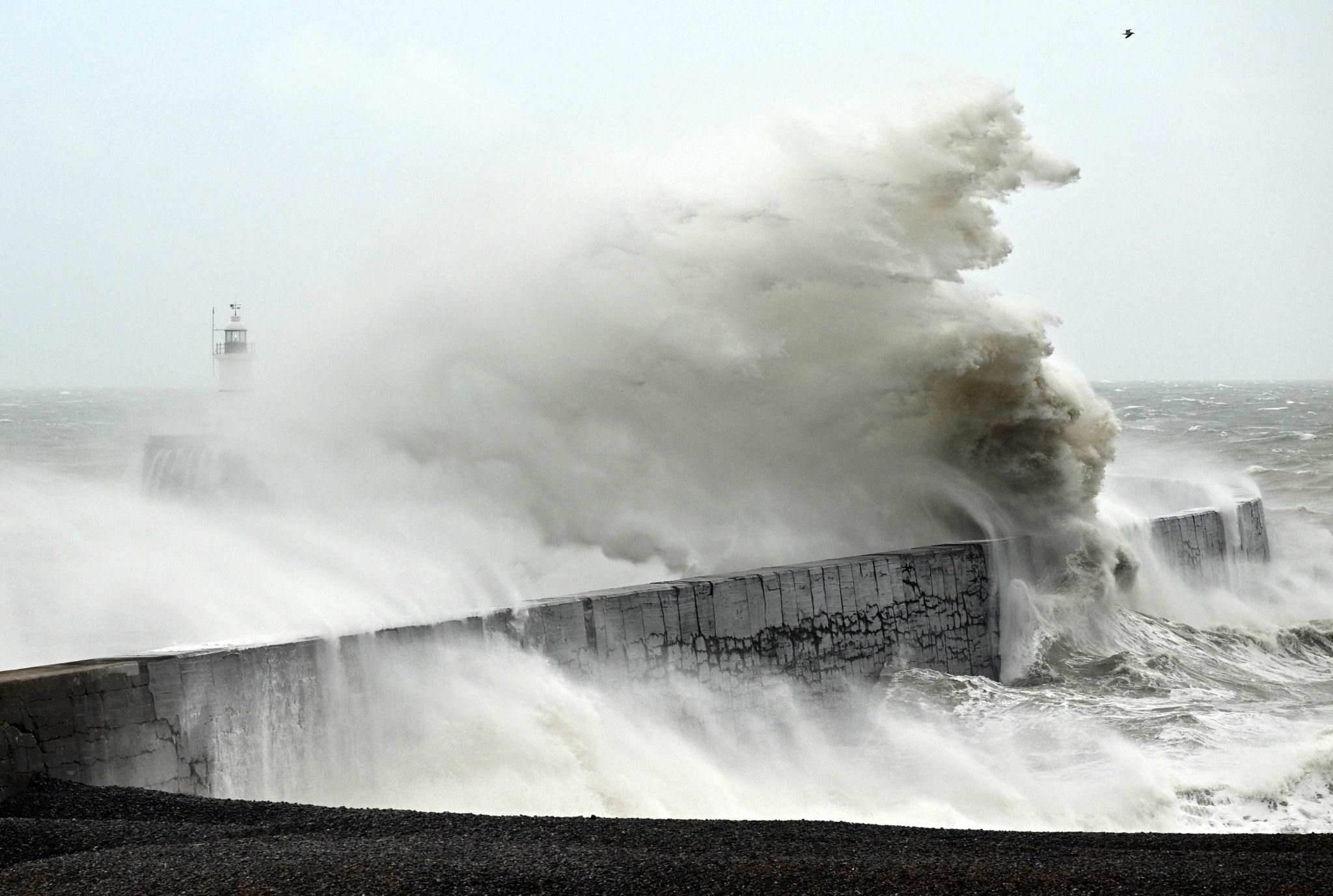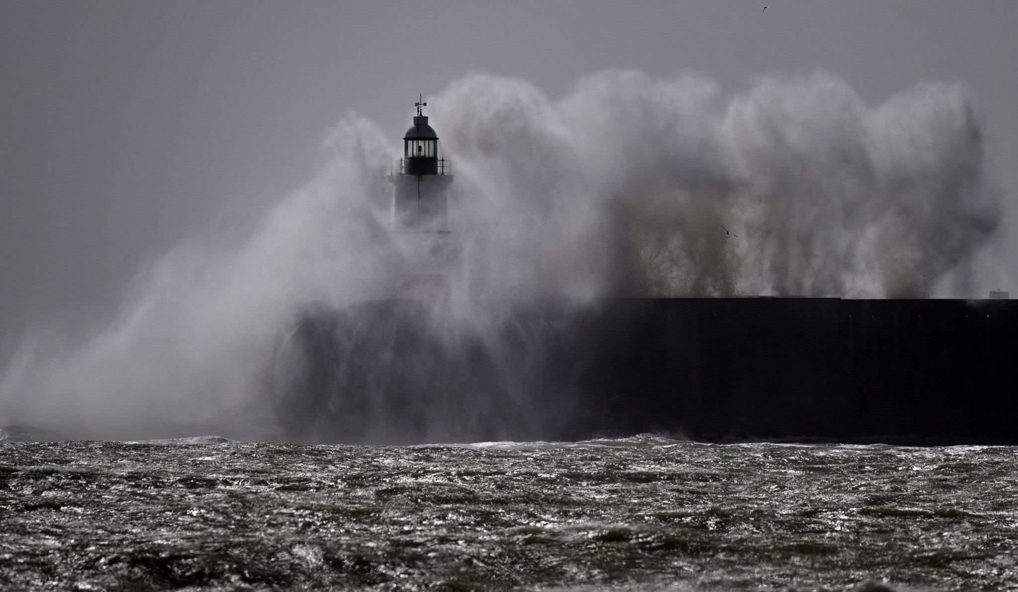 當?shù)貢r間2023年4月12日,英國紐黑文,風暴襲擊南海岸,海浪沖擊燈塔。視覺中國