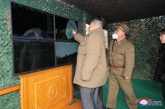 金正恩在試射現(xiàn)場觀察了發(fā)射前的準備過程,了解了新型武器系統(tǒng)。