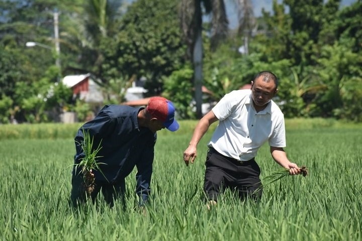 4月26日,在多米尼加首都圣多明各西北約80公里處,中國(guó)農(nóng)業(yè)專家(右)和當(dāng)?shù)剞r(nóng)民在多米尼加國(guó)家水稻培訓(xùn)中心的一片試驗(yàn)田內(nèi)工作。新華社記者 朱婉君 攝