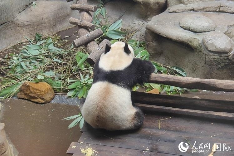 記者趕到時(shí),離開爸爸媽媽單獨(dú)生活的“圓夢”正躺在木床上呼呼大睡,四仰八叉的可愛模樣吸引游客們紛紛駐足,拍照留念。動(dòng)物園工作人員介紹說,“圓夢”現(xiàn)在已經(jīng)五歲多了,體重超過100公斤,身高也同成年大熊貓無差,活潑好動(dòng)、元?dú)鉂M滿。隨著飼養(yǎng)員往園內(nèi)投入新鮮的竹子,“圓夢”也慢慢醒過來,開始享用竹子大餐。“我可以一整天在這里看它吃飯!真的太可愛了!這是我在動(dòng)物園最喜歡的動(dòng)物!”今年8歲的梅麗莎興奮地說。