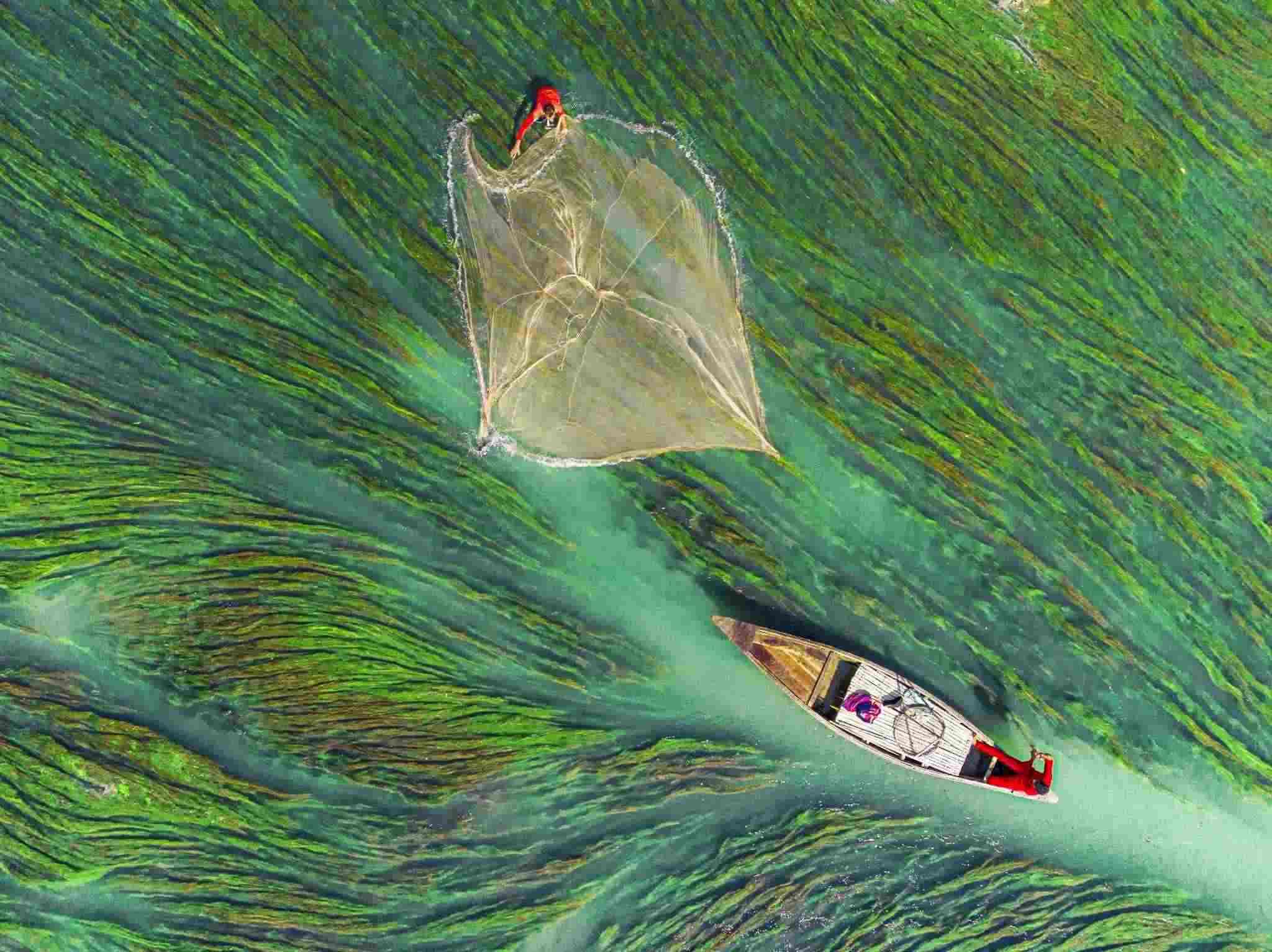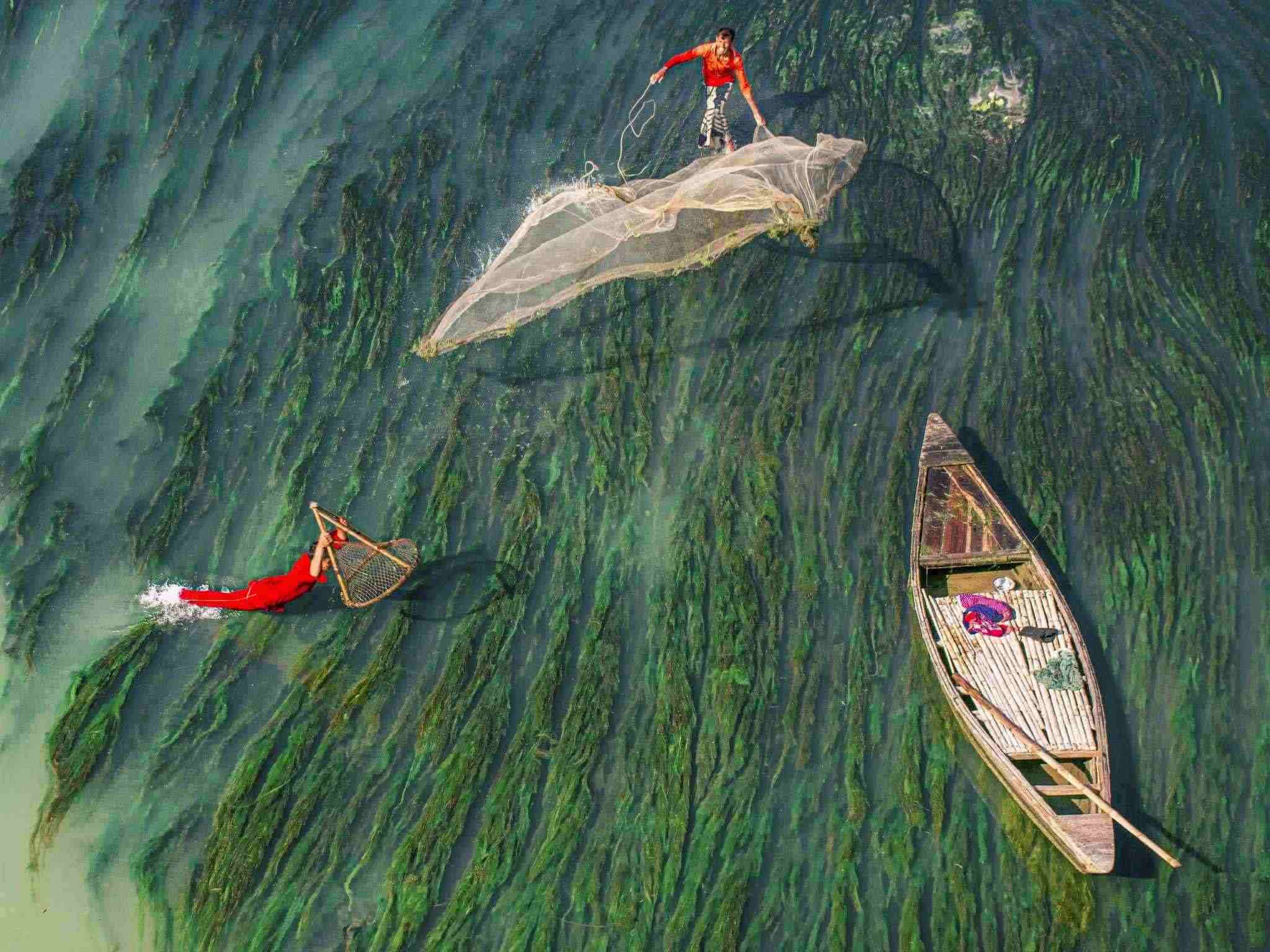 孟加拉拉杰沙希,漁民在河中撒網(wǎng)捕魚,周圍被多彩的水藻包圍。視覺中國