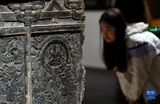 5月8日,游客在西安博物院參觀史君墓石槨。墓主史君是北周涼州薩保,粟特人。石槨整體為中國(guó)傳統(tǒng)歇山頂?shù)钐檬浇ㄖ谋诟〉駜?nèi)容和風(fēng)格則帶有鮮明的西域特色。