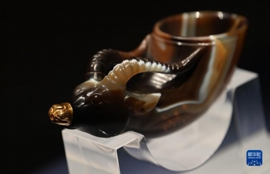 5月11日,游客在陜西歷史博物館參觀鑲金獸首瑪瑙杯。鑲金獸首瑪瑙杯的造型,與起源于古希臘的酒具“來(lái)通”相似,“來(lái)通”曾廣泛流行于中亞、西亞地區(qū),沿著絲綢之路不斷東傳進(jìn)入中國(guó)。