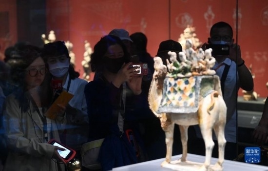 5月11日,游客在陜西歷史博物館參觀唐三彩駱駝?shì)d樂(lè)俑。這件唐三彩駱駝?shì)d樂(lè)俑既是唐代文化藝術(shù)、制作工藝發(fā)達(dá)昌盛的重要物證,也見(jiàn)證了絲綢之路上藝術(shù)的交流與融合。
