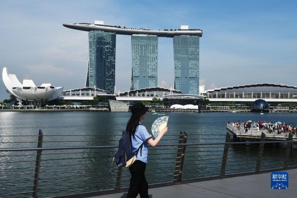 5月18日,行人在新加坡街頭扇扇子。