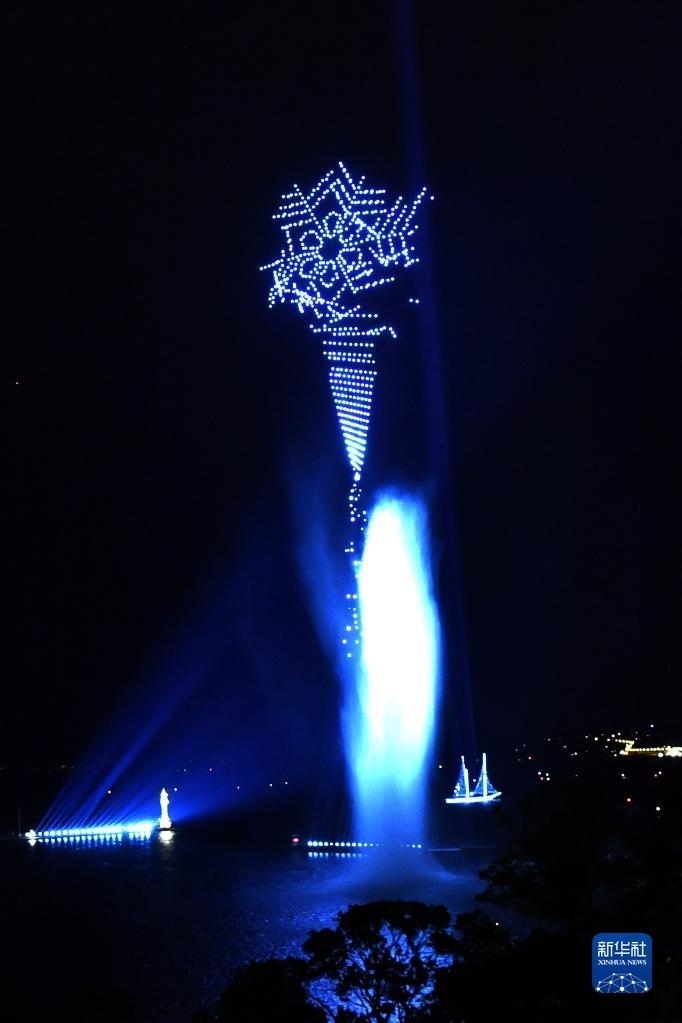 當(dāng)晚,無(wú)人機(jī)光影音樂(lè)秀在瑞士日內(nèi)瓦湖上舉行,超過(guò)1350架無(wú)人機(jī)點(diǎn)亮夜空,吸引市民駐足觀看。新華社記者 連漪 攝
