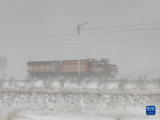 5月20日,在蒙古國蘇赫巴托爾省,貨車在暴風雪中行駛。新華社發(fā)(蒙古國蘇赫巴托爾省BBS電視臺供圖)