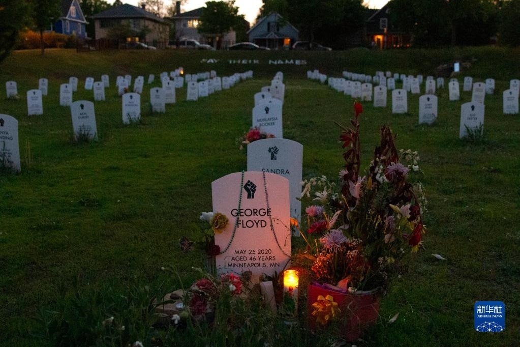 這是5月25日在美國明尼蘇達州明尼阿波利斯市拍攝的弗洛伊德墓碑前擺放的鮮花。新華社發(fā)(比利·布里格斯攝)