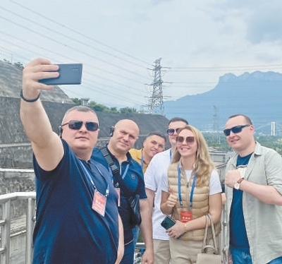 摩爾多瓦代表在宜昌市三峽船閘觀景臺上自拍。本報記者 王驍波攝