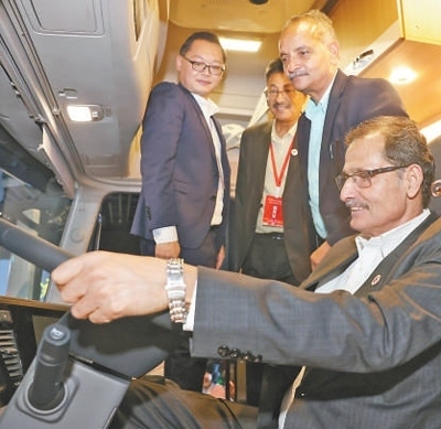 尼泊爾代表在十堰市東風商用車品牌體驗中心了解產(chǎn)品信息。劉 旻攝