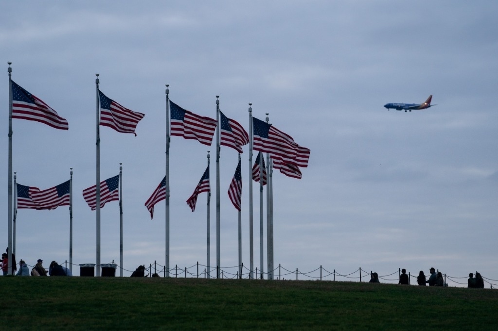 2022年11月10日,在美國首都華盛頓,一架飛機(jī)從美國國旗上空飛過。新華社記者劉杰攝