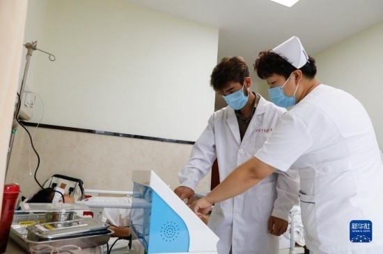 甘肅中醫(yī)藥大學針灸推拿專業(yè)的塔吉克斯坦留學生紀明哲(左)在老師的指導下學習直流電離子機器操作(7月27日攝)。新華社記者 陳斌 攝