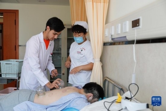 甘肅中醫(yī)藥大學針灸推拿專業(yè)的土庫曼斯坦留學生迪達在臨床實習中為患者進行火灸治療(7月28日攝)。新華社記者 方欣 攝