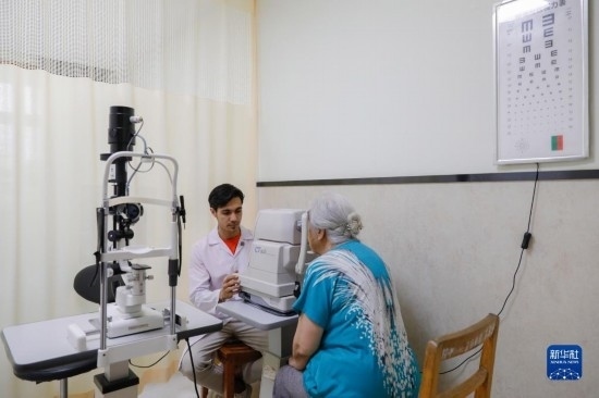 甘肅中醫(yī)藥大學針灸推拿專業(yè)的土庫曼斯坦留學生迪達(左)在臨床實習中為患者檢查眼睛(7月28日攝)。新華社記者 方欣 攝