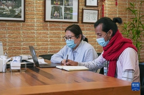 7月20日,在匈牙利布達佩斯匈牙利岐黃中醫(yī)藥中心,中心負責人陳震(右)和甘肅外派專家張海芳一同討論。新華社發(fā)(弗爾季·奧蒂洛攝)